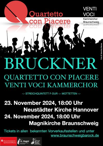 Am Sonntag, 24. November, konzertiert das erweiterte Quartetto Con Piacere (Ingo Fritz und Ulla Bundies, Violinen, Christoph Schinke und Klaus Bundies, Bratschen, und Henning Bundies, Violoncello) gemeinsam mit dem Venti Voci Kammerchor Braunschweig (Leitung von Viktor Otto) sein aktuelles Bruckner-Programm in der Braunschweiger Magni-Kirche am Ölschlägern. Zu hören sind Chormotetten Bruckners sowie das Streichquintett F-Dur. "Es ist eine Musik, die einen in seinen Bann zieht und nicht mehr loslassen will - und wir freuen uns sehr darauf, im November diese Musik gemeinsam mit Dir/Euch/Ihnen teilen und erleben zu können!", schreibt Henning Bundies, der das Konzert in St. Magni organisiert.